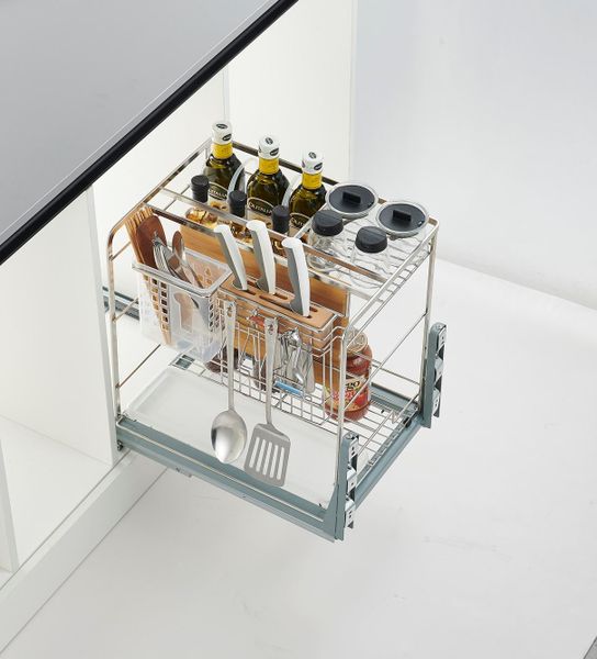 Đây là loại kệ được lắp đặt âm tủ, có ray trượt giảm chấn, dùng để chứa đồng thời: dao, thớt, chai lọ gia vị và đũa/muỗng.