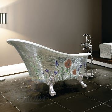 Nhưng đó chưa phải là tất cả. Điểm nhấn của bồn tắm NG-1896G lại nằm ở bề mặt bên ngoài của nó. Toàn bộ bề mặt bên ngoài bồn tắm đều được phủ lên một màu vàng lấp lánh. Thân bồn tắm được khảm kính màu vàng hoàn toàn. Những miếng kính nhỏ bé được bàn tay khéo kéo của các nghệ nhân cẩn thận đính lên bề mặt acrylic. Bồn tắm cao cấp nằm BRODA sẽ luôn sáng lấp lánh ánh vàng từ mọi góc nhìn.