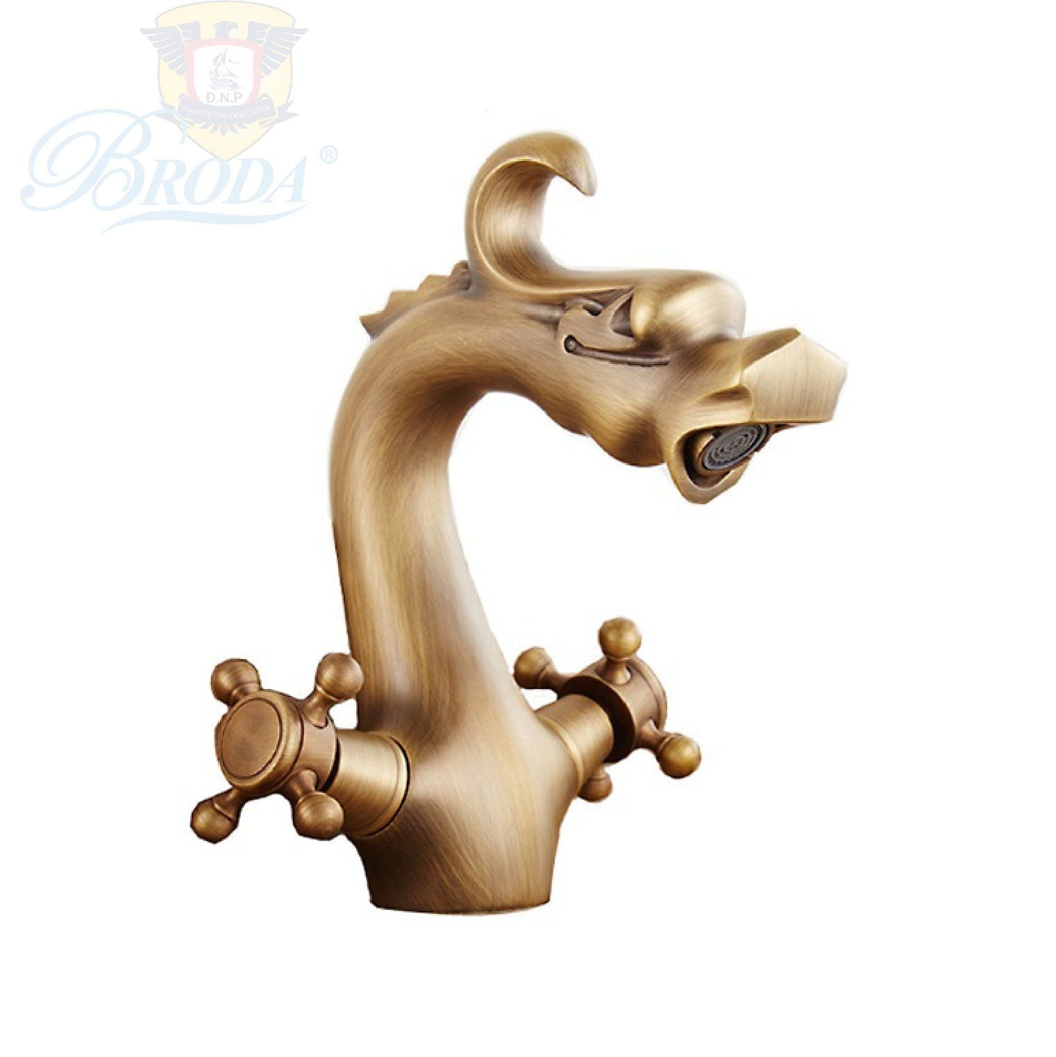 Vòi lavabo GIẢ CỔ Broda 89269F hình con rồng, phun nước, bằng đồng thau, nóng lạnh, kiểu cổ điển loại có kiểu tay mở nước kiểu cổ điển 4 chấu vặn, van mở nước nóng lạnh riêng, hình dáng lấy cảm hứng từ con rồng quyền quý cao sang, hoàng gia quý phái, kiểu dáng cổ điển thủ công, thân thấp, gắn trên vành hoặc trên mặt bàn đối với lavabo âm bàn.